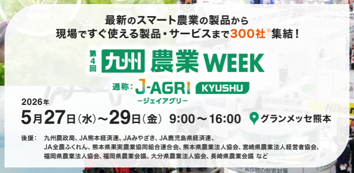 2026年5月27日(水)~ 5月29日(金)にグランメッセ熊本 にて開催される「農業WEEK J-AGRI -ジェイアグリ- 九州展」に出展いたします。
